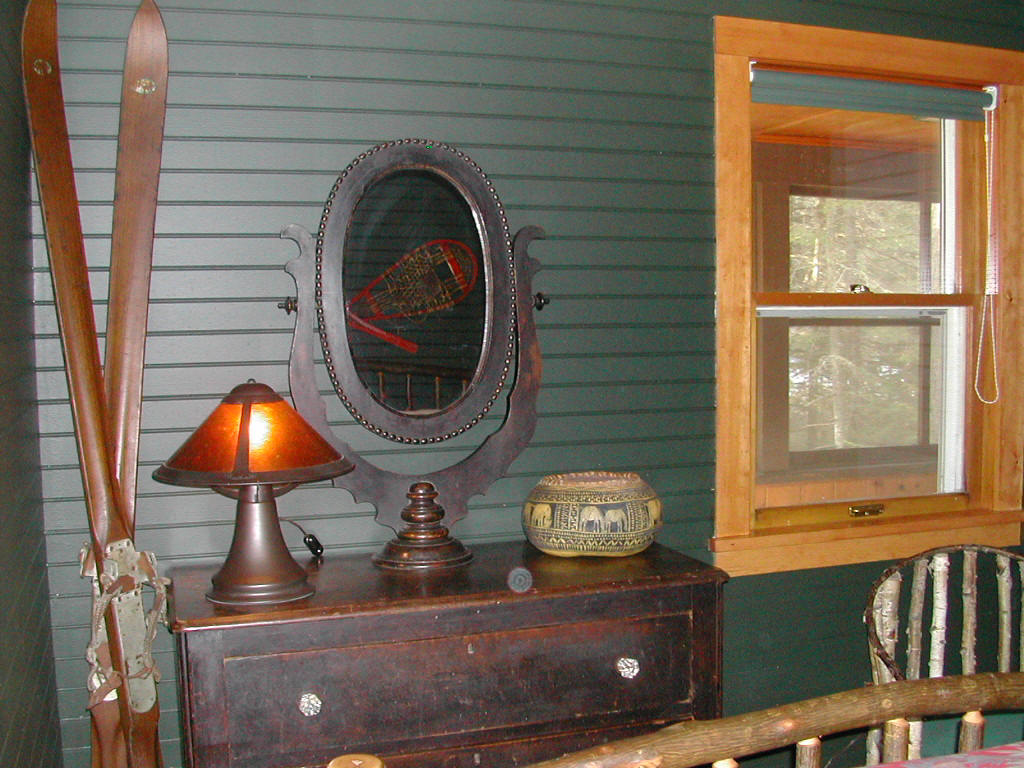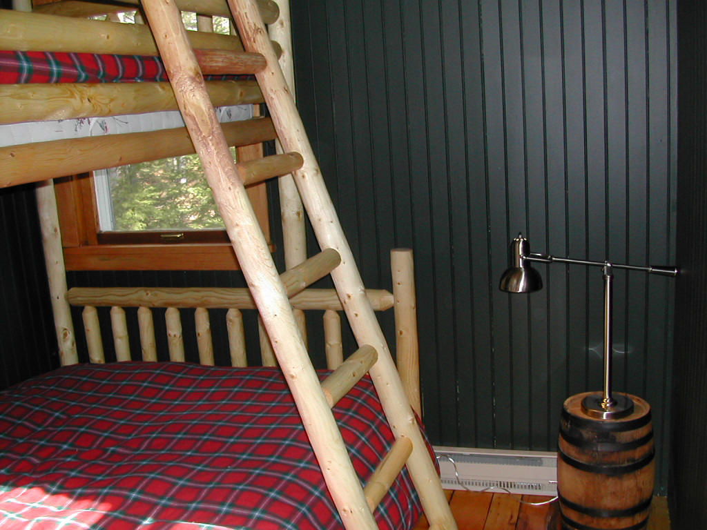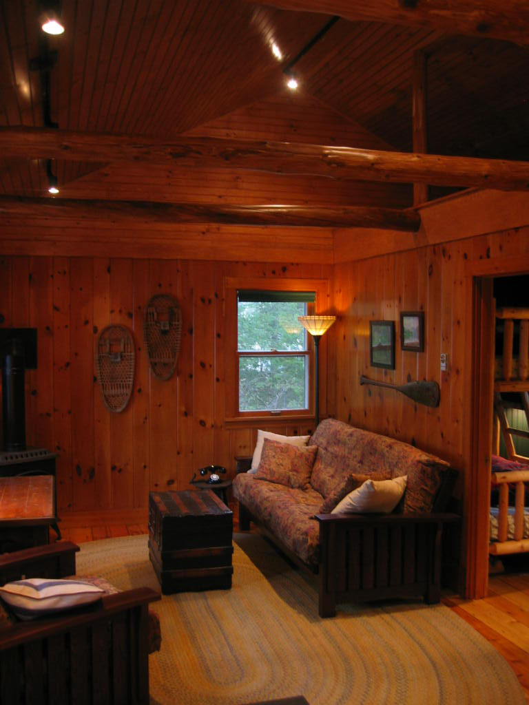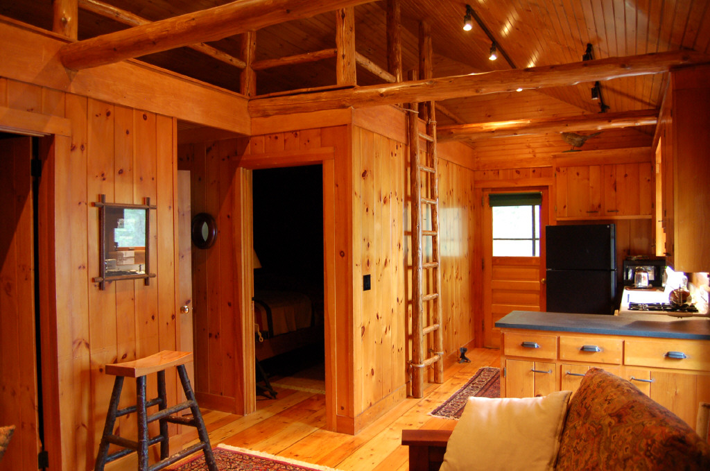 the cedar log beams over head, to the vaulted pine bead board ceilings